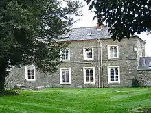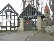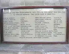 A glacial boulder by the path to the lych-gate marks the meeting point of three of the 15 townships in the parish, Berriew, Cil and Faenor Issa (Lower Vaynor). The lych-gate was erected as a memorial to those who fell in the Great War 1914–1918. The names of those who fell in the Second World War 1939–1945 were added later.[9] This is presumably the War Memorial of 1933 by Ninian Comper.[10] The lychgate is in the same position as the one shown in the 1800 print by William Parslow.