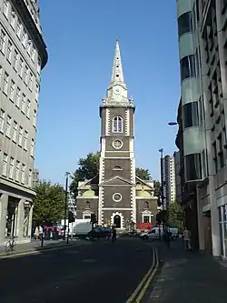 The church was rebuilt in the 16th century[3] at the cost of the priors of the Holy Trinity,[10] and renovated in 1621.[11] It escaped the Great Fire of London, and was described at the beginning of the 18th century as "an old church, built of Brick, Rubble and Stone, rendered over, and ... of the Gothick order".[11] The building, as it stood at that time, was 78-foot long (24 m) and 53-foot wide (16 m). There was a tower, about 100-foot tall (30 m), with six bells.[11]