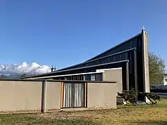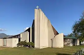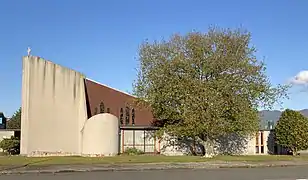 Officially opened by Cardinal Reginald Delargey on 8 August 1976,[13] St Canice's Church was John Scott's final new church commission.[15][16] Its modern design was challenging at first to some parishioners, who preferred the more traditional style of the building that it replaced.[17] Like all of Scott's churches, the design of St Canice's is predicated on a strong geometric concept—in this case a fan—and embodied much experimentation, and interplay of coloured light with a complex geometry. A series of four stepped triangular sections are arranged radially, rising up above the altar, and clerestory windows use Scott's typical coloured acrylic glazing, in red, green, yellow and blue. Elsewhere, stained-glass windows from the earlier church have been incorporated. Other materials favoured by Scott are also used: cast concrete, concrete block, and stained timber. Mataī tongue and groove lines the ceiling.[18][19][20] Built by local contractors H. J. Neilson Ltd, the construction cost was about $100,000.[21]