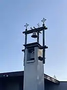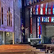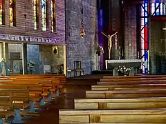 As well as some of the stained glass, a number of other elements of the previous church were also reused, including the bell, sanctuary lamp, baptismal font, the stations of the cross, several statues, and the cross on the new church roof. New timber pews replaced the old ones, which were infested with borer.[22] A tapestry, Spiral with Cross, was woven for the church in 1983 by Westport artist Marilyn Rea-Menzies.