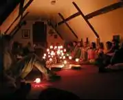 The floor space is lined with cushions for seating and the centrepiece of the room is a sprawling candle holder with many candles. These candles are lit whenever the room is used for reflection.