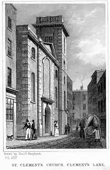 In 1670, during the rebuilding of London that followed the fire, the parish was combined with that of St Martin Orgar, which lay on the south side of Eastcheap. At the same time the City planners sought to appropriate a strip of land from the west of St Clement's property to widen Clement's Lane. This led to a dispute with the parish authorities, who claimed that the proposed plan left too little room to accommodate the families of the newly combined parishes. The matter was resolved by permitting the addition of a 14 ft. building plot, formerly occupied by the churchyard, to the east of the church. It was not until 1683, however, that building of the church began,[6] and was completed in 1687 at a total cost of £4,365.[7]