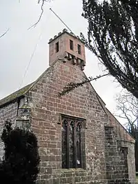 St Columba's is constructed in red sandstone with a slate roof, and has a cruciform plan.[2][3] The plan consists of a nave, a south aisle, a south porch, north and south transepts, and a chancel.[2][3][4] The north wall of the nave is Norman. At the west end of the church is a bellcote in the form of a turret, and adjacent to the south door is a "huge emergency buttress".[4] The north transept is in Early English style. The windows in the nave and the aisle are in Perpendicular style, and the 19th-century chancel is Early English, with three widely spaced lancet windows at the east end. The buttresses around the chancel are semi-octagonal in plan, and have square tops.[4]