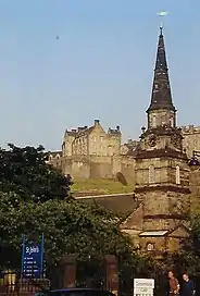 St Cuthbert's is situated within a large churchyard that bounds Princes Street Gardens and Lothian Road. A church was probably founded on this site during or shortly after the life of Cuthbert. The church is first recorded in 1128, when David I granted it to Holyrood Abbey. At that time, the church covered an extensive parish, which was gradually reduced until the 20th century by the erection and expansion of other parishes, many of which were founded as chapels of ease of St Cuthbert's. St Cuthbert's became a Protestant church at the Scottish Reformation in 1560: from after the Reformation until the 19th century, the church was usually called the West Kirk.[6][lower-alpha 1] After the Restoration in 1660, the congregation remained loyal to the Covenanters. The church's position at the foot of Castle Rock saw it damaged or destroyed at least four times between the 14th and 17th centuries.[8]