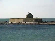 Dating from the 12th century,[1] Eglwys Cwyfan is dedicated to Saint Kevin, who founded the monastery at Glendalough in County Wicklow, Ireland.[2] The church originally stood at the end of a peninsula between two bays, Porth Cwyfan and Porth China. In later years the sea slowly eroded around the coast in the two bays, therefore the peninsula was cut off, turning Cribinau into a small tidal island. As a consequence, a causeway was built to the island to allow the local population to get to the church.[2]