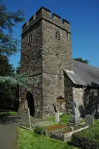 The style of the building is Perpendicular.[8] The West Tower is two-storeyed and without buttresses.[8] The medieval roof of the nave has been exposed during current renovations.[9] Simon Jenkins described the early 20th century restoration of the interior as "masterly" and attributes it to W. D. Caröe.[10] In addition to the medieval wall painting, the interior has a number of 17th century painted inscriptions.[8] It also has some funerary monuments, including one dedicated to John Morgan, and dated 1805, by Tyley of Bristol. The monument depicts a woman crying over an urn under a spreading weeping willow. Opinions differ as to its quality; the Cadw record describes it as "good",[1] while Newman considers it "hackneyed."[8] Newman takes a more positive view of the church overall, considering it "one of the most interesting in the Usk Valley".[8] The pulpit is a reconstructed example from the 18th century, with an associated sounding board to amplify the preacher's voice.[1] The pews are of the 19th century, and the now-refurbished organ dates from 1933.[1]