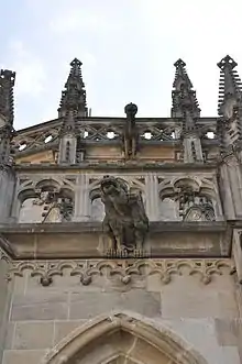 The late-Gothic St Joseph's Chapel at the north part of the cathedral was completely removed. A neo-Gothic tower which was crossing the main and the side aisles, flèche was created. Steindl's primary plan was to rebuild all the neo-Gothic additional building and components in the cathedral. But those suggestions were declined by the commission and they requested a cheaper exchange of old stone parts for the new ones. Re-Gothicisation of the towers was not realized due to a lack of funds, reflected in a cheaper construction material. During the exchange of a base system from 1878 to 1882 cheap but low-quality sandstone from the nearby Spiššké Vlachy stone-pit was used.[12] Its quick dilapidated outer surface resulted in removal of pinnacles and gargoyles because they endangered pedestrians. With the next reconstruction after 1882 good quality sandstone from Banská Bystrica was used.[11] The main Master builder of the major reconstruction from 1877 to 1880 was Josepf Weber.