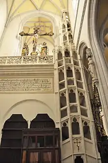 In 1508, the presbytery was completed; this is considered to be the year when the cathedral construction was finished. This fact is documented by the scroll of parchment with the particular year and the name of master builder Krumpholz which was found in the presbytery pillar after the big reconstruction of the church in 1908.[11]
