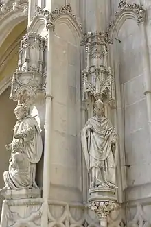 The niches are original and it is not known what statues stood on them during the last centuries. The other neo-Gothic statues decorate the portal of the east gavel. The statues are Ugarian kings Charles I of Hungary, his wife Elizabeth of Poland and Louis of Hungary. They are masterpieces of the Budapest sculptor Lajos Lantay.