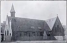 Over the years 1855 and 1856 a simple single aisled bluestone church, consisting of a nave and tower, was constructed on land granted to the Catholic Church in Carlton. This building, known as St George's, Carlton, was to serve a dual purpose as a church on Sundays and a school during weekdays and remained in use as a school for many years. In 1866 a transept was added to the church to cater for the expanding local population and its children. James Hennessy O'Connell was made pastor to the parish in 1881 and began raising funds to expand the complex which later included the erection of a new church, the Church of the Sacred Heart in 1899, new school buildings and a hall.[3]