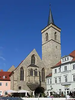 St Giles' Church (German: Ägidienkirche, also St. Ägidii[1]) in the historical centre of the city of Erfurt in Thuringia, Germany, forms the eastern entrance from Wenigemarkt (Minor Market) to the Krämerbrücke (Merchants' Bridge) with its archway. The single-nave Gothic church building[2] is one of the former two bridgehead churches. At the western end stood the Benediktikirche (St Benedict's Church) since the 11th century, which was demolished in 1890[3] and is now only remembered by the name of Benediktsplatz (St Benedict's Square).