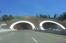 The St Helena Tunnel is a twin-tube road tunnel that forms part of the Pacific Highway near Byron Bay, New South Wales, Australia. The 434-metre-long (1,424 ft) tunnel under St Helena Hill in the locality of Ewingsdale was built as part of the 17-kilometre (11 mi) Tintenbar to Ewingsdale upgrade, which involved a new alignment of the highway.