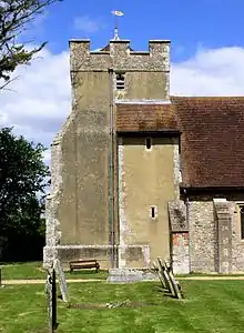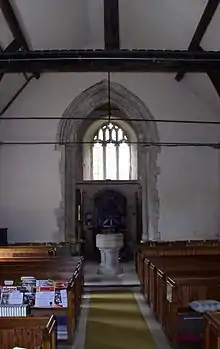 The church consists of a nave, with a south porch, chancel and tower. The nave is in three bays, marked on the outside by buttresses. The inner stonework of the windows dates from the Victorian restoration. The window in the second bay on the north has some ancient exterior stonework remaining.[1] The squat tower is rendered and has diagonal buttresses.[2] It was built around 1545, but an earlier tower may have been either planned or actually built. The evidence for this is in the sixteenth century Perpendicular style tower arch which sits on apparently fourteenth century shafts which are too small for it, leading to an awkward appearance.[1][2][3] The chancel dates entirely from the restoration of 1863.[2] It has fourteenth century style windows and a buttress in the middle of the north and south walls. The chancel arch is fourteenth century.[1][2][3]