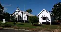 The grounds, which slope to the southwest, are grassed and there are concrete paths connecting the church and church hall. Plantings considered to be of cultural heritage significance include an indigenous Terminalia at the south/southwest corner of the site and mature Frangipani (Plumeria) trees. There is a tall metal flagpole in the front yard of the church and in the yard behind the church and hall is an area formerly levelled for a tennis court. A small, skillion-roofed, concrete block toilet block at the rear, between the hall and the church, is of later construction and is not considered to be of cultural heritage significance. Along the street alignment, partly in front of the rectory and partly in front of the church, there is an early, low concrete retaining wall and entrance steps flagged by low, square concrete columns topped with cast iron capitals. This appears to indicate an earlier configuration of buildings on the site. The remainder of the frontage has a later low retaining wall, of concrete and concrete block. The precinct has an aesthetic appeal based on the picturesque quality of the simple timber buildings in their garden setting and visually complements the school grounds across the street.[1]