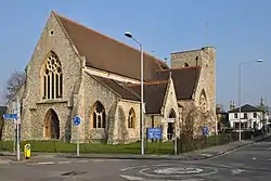 The church dates from June 1870, when a temporary iron building was constructed on the corner of Springfield Road and Denmark Road. Bishop Samuel Wilberforce laid the foundation stone for a permanent church in July 1871, on a site donated by William Mercer in the centre of the new Spring Grove Estate. Mercer also gave £2000 towards the cost of building the church, but it was with difficulty that £7000 was raised to build the essentials. The church was consecrated in November 1872 without the tower or spire that were in the original design by the Surbiton architect A. J. Phelps and with little internal ornament. Carvings, paintings, coloured windows and an organ were introduced over time, but the tower, a squat structure with octagonal turret in matching style, was not added until 1935.[1][2]