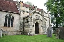 The Sidney Chapel is the third chapel on the site.[4] It rises above the line of the South aisle, and has a 19th-century East window. On the South side, it has a three light 19th century window (one light blocked) with a square head and its own projecting South porch with a curved, embattled parapet. The South door with a square surrounded with foliage carving in the spandrels and a coat of arms above it, flanked by inverted torches. Internally the porch is rib-vaulted. There is a narrow, 13th century arch which reaches from the South aisle in the church into the chapel, and next to it is a 13th-century lancet that now opens internally from the chapel to the aisle, indicating that the aisle was once narrower than the chapel.[3]