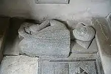 - Two 13th century coffin slabs under the tower, one with a cross superimposed over the figure of a praying woman.[3]