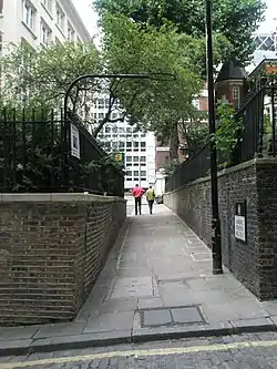 St Laurence's was destroyed in the Great Fire of London of 1666. An eye-witness told the Government inquiry into the fire that he "saw the Fire break out from the inside of Lawrence Pountney Steeple, when there was no fire near it", implying the possibility of arson.[5] The church was not rebuilt. Instead the parish was united to that of St Mary Abchurch.[1] The old churchyard, which lay to the south side of the church continued to be used for burials; in the 1850s it was converted into the garden of a neighbouring house, then occupied by the architect Edward I'Anson. This 17th century building, which still exists, is now numbered as 7a Laurence Pountney Hill.[1] The site of the church itself, which became known as the "Church Ground", was used as an additional burial ground following the Great Fire, and is now also a privately owned garden.[6]
