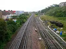 Following nationalisation, the shed was given the code 74E[38] and it received a new asbestos roof with brick gables.[32] However, by 1957 the depot's role was much reduced as a result of the first stages of dieselisation which had led to the closure of the servicing point at Hastings station and the withdrawal of most of St Leonards' engines.[32] Further dieselisation resulted in the depot's effective closure in June 1958, although engines continued to be serviced and stabled until 10 November 1967.[34][32][31] The bulk of the shed's remaining allocation was transferred to Ashford, Brighton, Tonbridge and Tunbridge Wells West.[33] The depot has now been completely demolished.[32] A new diesel depot was opened to the west of the old steam motive power depot.[3]