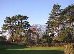St Luke's is constructed in sandstone rubble, with red tiled roofs and a timber porch. Its plan consists of a nave, a north aisle, a north porch, a chancel, and a tower at the crossing.[2] The tower has a hipped roof, a buttress at the southwest, and a stair turret rising to a greater height than the tower at the south east.[3] A wooden bellcote protrudes from the roof of the tower.[2]