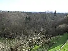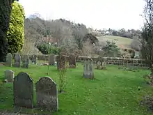 St Margaret's Church has an extensive terraced churchyard with far-reaching southward views across the Weald to the South Downs. Set across six levels, it is heavily planted with trees and flowers—more than 100 species have been documented—and has several seats and a signposted viewing area.[2][4][16][28][29] It has been extended several times. One extension, described in 1935 as "recent", brought an artificial cave, possibly of medieval origin, into its boundaries. It is hewn out of the rock near the floor of the valley above which the churchyard sits.[19]