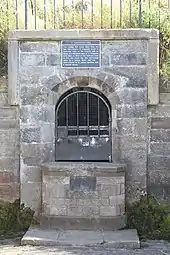 A plaque above the well informs: "This unique Well House dates from the late 15th Century. It originally stood at Restalrig, close to the Church, and its design is a miniature copy of St. Triduana's Aisle there. In 1860 it was removed from its first site, which was then encroached upon by a railway depot, and was reconstructed in its present position near a natural spring."