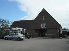 Housing developed near Hampden Park railway station (initially named Willingdon) after it opened in 1888.[3][4] In June 1906, the vicar of Willingdon considered opening a chapel of ease to serve the area. He received support from Freeman Freeman-Thomas, 1st Marquess of Willingdon and his wife Marie: he gave land for the church and she arranged a fundraising concert which added £200 (£22,900 in 2023)[5] to the building fund.[4] The Marchioness laid the first stone of the chapel of ease on 2 May 1908, and it opened in November of that year.[4] Architect William Hay Murray designed a Vernacular-style red-brick, stone and tile building with windows extending above the line of the eaves.[4][6] Born in London, Murray had established an architectural practice in Hastings by 1874 and had apparently moved to Eastbourne by 1894. He designed or altered several Anglican churches in both towns.[7]