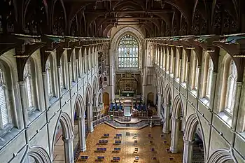 The interior is light, open, and airy.[4] The main entrance is located under the tower, and there is a decorative lierne vault between the west window and the tower arch. The west window itself is of 4-light stained glass, dedicated to the memory of W. H. Smith.[13] The tower is notably thinner than the nave and, as such, the tower arch does not span the entirety of the nave's west wall. Above the tower arch is a three-light stone window frame, the middle panel of which provides views of the church from the ringing chamber behind it.[4]