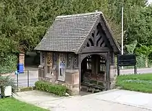 The lychgate at the northern entrance to the churchyard doubles as a war memorial and was erected by public subscription and a donation from the Mosley family in 1919. Designed by Lincolnshire architect Cecil Greenwood Hare and built in Lichfield, the structure contains a bronze crucifix and lists of those villagers killed during the two world wars.[5]: 17 The pierced side panels were replaced with new versions, in oak, in the 2000s.[5]: 22 The lychgate was granted protection as a grade II listed building on 26 March 1986.[12]