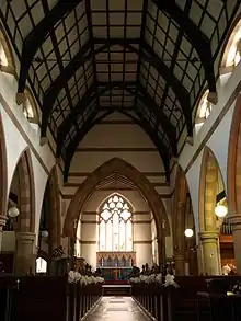 The church is cruciform, and the nave has a clerestory and north and south aisles with four-bay arcades.[5] The clerestory windows are slightly unusual, being quatrefoils set in groups of three.[6] Internally the walls are plastered, and the plastering is punctuated by horizontal bands of sandstone. In the transepts and nave the roof timbers are exposed and in the chancel they are gilded and painted in heraldic colours of red, blue, green, white and gold.