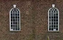 St Mary's is constructed in handmade brick that was originally plastered, with stone slate roofs and with ashlar upper parts to the tower. Its plan consists of a small rectangular building in four bays, with a semi-octagonal apse, a bell-tower at the west end, and to the west of this a flat-topped porch.[1] The church measures 47 feet 9 inches (14.55 m) by 21 feet (6.40 m), with the apse measuring 12 feet (3.66 m) by 8 feet (2.44 m).[3] Along the north and south walls are large round-headed windows with glazing bars that are continued upwards into intersecting tracery. Above each window is a keystone, and between the windows are triangular pilasters which act as buttresses.