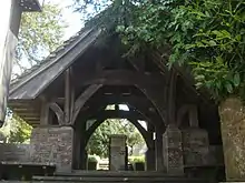 The Huth family were important in church life in the 19th and 20th centuries. Henry Huth was a bibliophile whose enormous collection of rare books was sold for £300,000 in 1910 (£32,580,000 in 2023).[17][18] He lived in an extravagant château-style 1870s house called Wykehurst Place in the parish,[19] and was buried in the churchyard after his death in 1878. In 1905, his son Edward gave the church a large, "magnificent"[1] lychgate constructed from local materials:[7] oak, millstones from a mill in the parish, Sussex Marble (a locally quarried limestone) and a Horsham Stone slab roof.[8][18] It stands at the end of the twitten leading to the churchyard, which has been left slightly overgrown to conserve wildlife.[7] A mid-19th-century rector planted the churchyard and rectory grounds with a wide range of trees, many of which survive—including Bhutan pines and oaks from Somerset.[20] There are many Victorian tombs and grave-markers in the churchyard, including some rare wooden grave-boards and some with wooden cross-pieces set between stone balls.[7] Another of Huth's sons, Alfred Henry Huth—who also became a book-collector and author, and who died in 1910—is commemorated by a memorial tablet inside the church; its style was described by Nikolaus Pevsner as "neo-late 17th-century".[10]