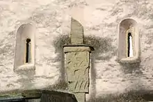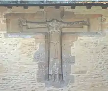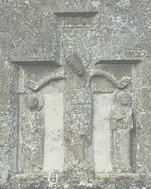 The porch includes two Anglo-Saxon stone rood reliefs, but they are repositioned and their original sites are not known. The one on the east wall of the porch is 8th century[7] and has lost its head.[8] The one on the south gable of the porch is 10th century[9] and has been assembled with Christ's left and right arms swapped over and the figures of Saint Mary and Saint John the Evangelist also transposed.[6]