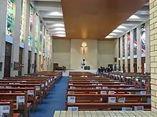 The floors are finished with a pale green vinyl tile; however, much of the nave floor has been covered with a dark blue carpet. The floor of the sanctuary was finished with a cream marbled tile, which has also been covered with a cream carpet.[1]