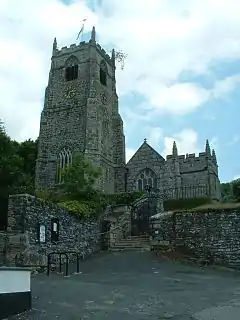 The original dedication may have been to 'St Anietus', with whom the Saxon Neot has been confused. In the 11th century a small monastery existed here; the early medieval church building (of which the tower remains) must have been smaller than the one in existence today. Rebuilding in granite was undertaken in the 15th century and the fine stained-glass windows are from about 1500.[7] The stained glass is partly original and partly from a restoration done by John Hedgeland, c. 1830.[8]