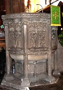 The pulpit (1901), carved by Nathaniel Hitch, depicts St Cuthbert holding the head of King Oswald, St Kentigern preaching to the workers, St Patrick preaching to Irish princesses and St Columba, seen with King Brude.[1]