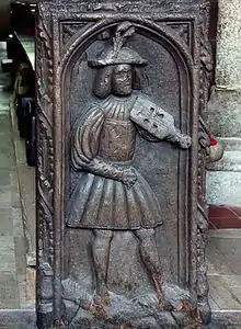 The screen is one of the finest 15th century examples in Cornwall; it has three gates and the cornice of vines and tracery and vaulting are finely carved.[5] The 79 bench-end carvings were executed by Robert Daye between 1510 and 1530 (Pevsner attributes them to 1524 or later) and portray a range of subjects including a Cornish piper and fiddler (Daye's name is given on one but the date is illegible).[6] Also, one of the damaged pew ends was repaired to its former glory by the late local master joiner Douglas Edwards in the 1980s.[7] Langdon (1896) records seven stone crosses in the parish, of which one is in the churchyard.