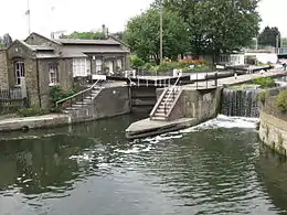 Regent's Canal was authorised by an Act of Parliament obtained on 13 July 1812, for a canal from Paddington to Limehouse.[1] The directors had decided that all locks would be paired when they first met, but were then sidetracked by proposals to use hydro-pneumatic boat lifts.[2] Operation of a trial lift built at Camden Town was problematic, and after a suggestion by Earl Stanhope in 1815 that they revert to single locks, the proprietors decided to follow their original decision, and so a pair of locks was built at St Pancras, and at the eleven other locations where locks were needed.[3] After some delay caused by financial difficulties, building of the canal resumed in December 1817, and it was officially opened on 1 August 1820.[4] St Pancras lock was built towards the end of the project, being completed in 1819.[5] The use of paired locks was partly to save water, as water could be transferred between the locks, rather than all of it being discharged into the lower pound when a lock was emptied. This made operation of the locks more complex, and so they were permanently manned during the heyday of the canal, with lock-keepers working a shift system to provide 24-hour cover. As the use of the canal declined, in part due to railway competition, manning levels were reduced, and padlocks were used to prevent operation of the locks at the weekends. Following the end of commercial traffic and the growth of leisure boating, the locks reverted to operation by boat crews, and in order to prevent flooding caused by incorrect operation of the paddles, in the 1980s the gates were removed from the northernmost lock, and a weir and spillway were constructed at the lower end.[6]