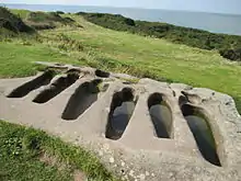Near the chapel is a group of six rock-cut tombs from the 11th century and a separate group of two rock-cut tombs. Each group is listed at Grade I, and each tomb has an associated socket probably intended for a timber cross.[4][5] They also featured on the cover of Black Sabbath's 2000 album The Best of Black Sabbath.[6]