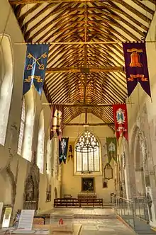 Between the nave and the north aisle is a three-bay arcade, and between the chancel and the aisle is a two-bay arcade; both are carried on polygonal piers. In the chancel is a three-seat sedilia, which dates from the 13th century, and a piscina. There is a blocked squint in the sedilia, and another in the north chapel. Also present in the church are the royal arms of Charles II. In the north aisle are a number of late 14th-century tomb recesses.[1] The organ is small, having a single manual, four stops, and 173 pipes. It incorporates pipes taken from an earlier organ that was built in about 1880 by Charles H. Hobday, and was installed in the north aisle in 1895. It has since been rebuilt and now stands in the nave.[4] There is a ring of eight bells, all cast in 1779 by William Mears. They are unringable because the tower is unsafe,[5] having last been rung (except for the curfew bell) in 1913.[6]