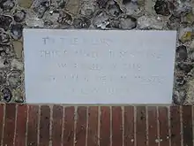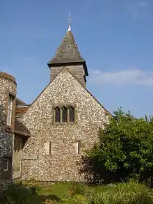 The church is in three distinct parts—Saxon/Norman, late 19th century and mid-20th century—which nevertheless blend together well.[9] As originally built, the church was approximately 35 feet (11 m) long and 16 feet (5 m) wide, rectangular, built of flint rubble with stones and tile fragments recovered from the Roman site, and featuring an altar in the centre. A chancel was then added during the early Norman era, as were two narrow windows in the west wall of the nave[5] which have been preserved in the present structure.[1] The south and west walls are mostly original.[12] The 19th-century rebuilding kept as much of the nave and chancel intact as possible, and added a short weatherborded bell-tower topped with a spire at the west end; a porch on the south side with a gabled roof; three Decorated-style lancet windows; and a barrel vault roof.[5][9] The bell in the bell-tower was cast in London in 1844.[8]