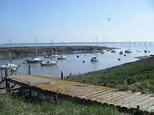 The harbour originally covered a much larger area, later silted up, and is believed to be the site of an important post-Roman harbour, associated with legends of St Tewdric. A ninth-century source which refers to the harbour as Porth-is-Coed – a name later used for the nearby village of Portskewett – also provides the first description of the tidal cycle in Britain.[14][15] According to Fred Hando, as recently as 1860, the harbour was navigable by 70-ton barges as far upstream as the present golf club.[16] Hando reports also that the Welsh Triads described it as "one of the three great ports of Britain."[17]
