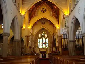 The cathedral building is made of sandstone from a quarry at Marulan, except for the pillars which are of Pyrmont sandstone. The roof is natural slate. The cathedral is unmistakably a Blacket church, on a grand scale, with nave, aisles, transepts, chancel, porches and tower. It has large and elaborate stone traceried windows and an impressive interior with a heavily carved hammer beam roof, clustered columns and foliage capitals, elaborately moulded arcades and chancel arch, and a striking use of figurative roundels in the nave, transepts and chancel.[4][1]