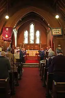 When the church opened, accompaniment for services was provided by a harmonium.[7] The first pipe organ was obtained second hand and installed by J.H. Adkins in 1913.[8] A specification of the organ can be found on the National Pipe Organ Register.[9]
