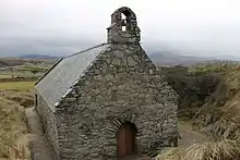 St Tanwg's church is a simple rectangular building, 57 feet (17 m) long (west-east) and 23 feet (7.0 m) wide (north-south), with a continuous nave and chancel.[3][2] The nave is probably 13th century, with the chancel added in the 15th century.[4] The church is built of local rubble stone with larger stone quoins and gritstone dressings.[7] The roof is of slate with rough stone dressings.[3]