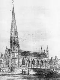The authors of the Buildings of England series state that the church has "a grand approach up steps with imposing gatepiers".[3] It is constructed in sandstone ashlar with slate roofs in Early English style. Its plan consists of a six-bay nave with north and south aisles under three gabled roofs; the nave is extended one bay to the west to form a narthex. At the east end is a two-bay chancel with a steeple in the angle between the north aisle and the chancel. The lower part of the steeple has two square stages, with buttresses and a stair turret. Above the level of the aisle it becomes octagonal with louvred bell openings. The spire is also octagonal, with two tiers of lucarnes, a finial and an iron cross. A plain parapet runs along the tops of the eaves and gables. In the west front are five tall stepped lancet windows under which is a triple doorway. On each side of the front are buttresses that rise up to turrets with finials. There are more lancet windows around the church, with a triple lancet at the east end.[2]