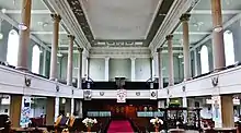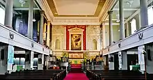 The church has galleries on three sides. They are carried on square columns, which are continued up to the ceiling in the form of fluted Corinthian columns.[4] The chancel, remodelled in 1890[6] is raised, and surrounded on three sides by a balustrade.[4] A semi-circular pulpit extends from the front of the balustrade on the north side; its lower part is in stone, and the upper in ironwork. In the corresponding position on the south side is a brass eagle lectern.[10] The marble reredos behind the high altar is carved with a depiction of the Annunciation. Above this is a copy of part of Raphael's painting Transfiguration of Jesus.[11] In the south aisle is St John's Altar, which was moved from the mission church of St John when it closed in 1941.[12] The east end of the north aisle is used as the Lady Chapel.[13] The baptistry contains an octagonal font, and is floored with a mosaic depicting fishes.[14] The stained glass dates from the late 19th century, and depicts scenes from the life of Jesus.[15]