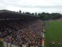The ground is named after Saint Tiarnach (Tigearnach, d. AD 548), who founded Clones as a monastic settlement c. AD 500.[2] The Ulster Final was held in Clones from 1905 until 2004. Prior to this, a mixture of grounds were used as venues for the Ulster final. Between 2004 and 2006, due to increased capacity, the Ulster Final was played at Croke Park in Dublin.[3][4] However, with the 2007 Leinster Senior Football Championship final being scheduled for the same date, that year's Ulster Final was restored to Clones, with Tyrone narrowly defeating Monaghan by a scoreline of 1–15 to 1–13.[5] The Ulster Final has been held in Clones every year since 2007. The capacity of St Tiernach’s Park capacity was originally 36,500 spectators, but that was reduced in 2019 following a health and safety review.[1] 2019 marked the 75th anniversary of St Tiernach's Park.