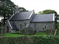 A survey by the Royal Commission on Ancient and Historical Monuments in Wales and Monmouthshire in 1937 noted an 18th-century communion table, an engraved Elizabethan silver cup and a silver paten dated 1721, and a memorial inside the church dated 1791.[6] A 19th-century writer noted a seat near the altar with "R.B. 1630" upon it, said to mark it as belonging to the Bulkeley family (who were prominent and influential landowners, in Anglesey and elsewhere in north Wales, from the 15th to the 19th centuries).[2][17] The churchyard contains a number of slate tombs and a sundial made from brass, dating from the 18th century, standing in the base of a medieval stone cross.[4][18]