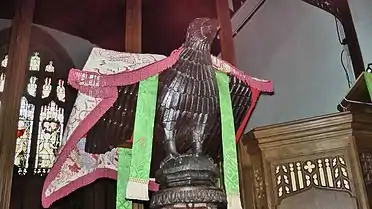 The church features a medieval carved wooden lectern of a black crow or (raven).